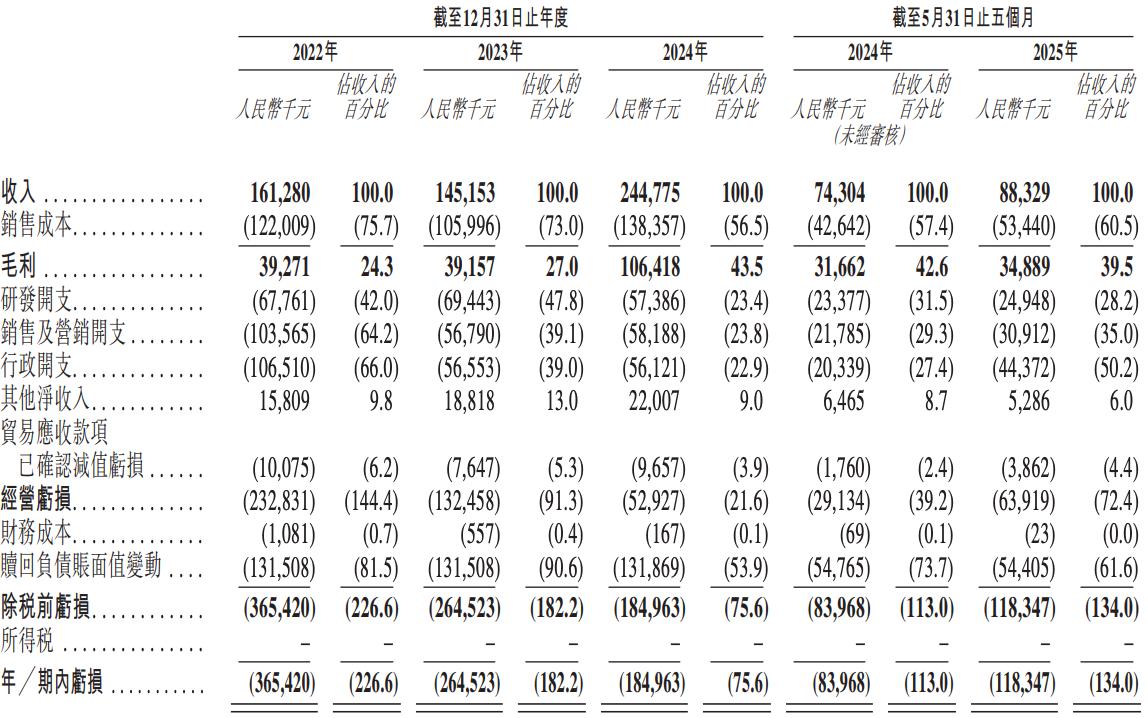 业绩方面,2022年、2023年、2024年度和2025年前五个月,云迹科技的营收分别约为人民币1.61亿、1.45亿元、2.45亿元和8332.9万元,净亏损分别为3.65亿元、2.65亿元、1.85亿元和1.18亿元。