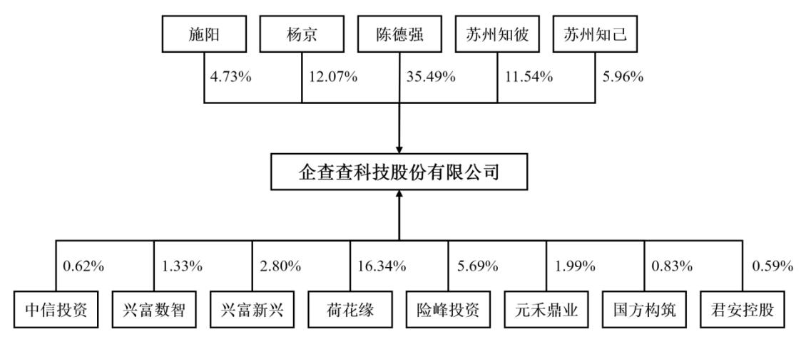 目前,陈德强为企查查董事长。相比之下,杨京直接持股12.07%,间接持股约2.58%(间接持股主体为苏州知己),为该企查查董事、总经理;施阳为该公司董事、副总经理,直接持股4.73%。