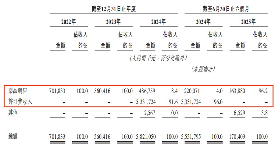 在2024年之前,药品销售是百利天恒核心营收来源,根据招股书所披露的数据,2022年和2023年,其总收入皆是由药品销售收入所贡献的,分别达7.02亿元、5.6亿元,但到了2024年,情况则发生了很大变化,药品销售收入不仅继续缩减,已经降至了4.87亿元,而且所占总营收的比重只有8.4%。