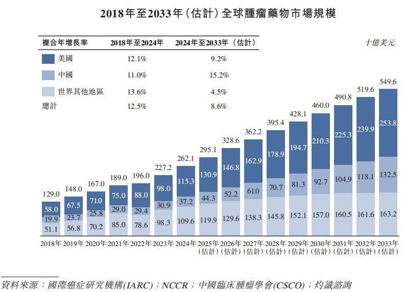 根据国际癌症研究机构、中国临床肿瘤学会及灼识咨询联合发布的数据显示,随着全球癌症新发病例数量的持续上升,推动全球、中国及美国的肿瘤药物市场于近年来迅速扩张。全球肿瘤药物市场由2018年的1290亿美元增至2024年的2621亿美元,复合年增长率为12.5%,并预计自2024年起以8.6%的复合年增长率增长至2033年的5496亿美元。