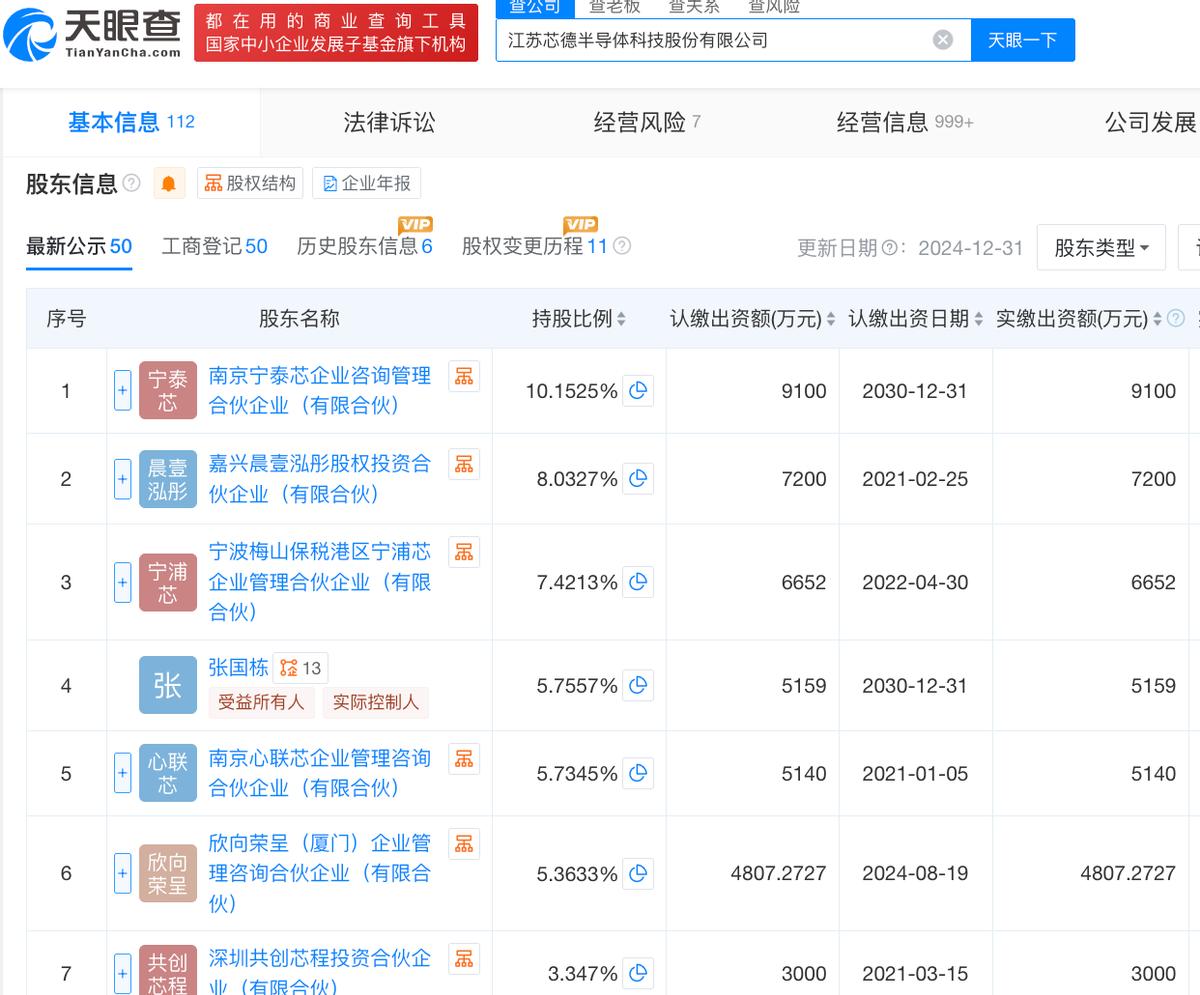 2021年1月,晨壹泓彤、嘉兴泰盈分别出资7800万元、2200万元参与对芯德科技的增资;同年3月,宁泰芯、上海厚杰亦分别出资1000万元、1亿元参与对芯德科技的增资;同年6月,张国栋、宁泰芯分别出资5000万元、5000万元参与增资。