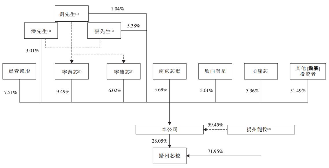 据招股书披露,芯德科技于2020年9月由心联芯、南京元钧、南京宁泰芯设立,注册资本为1.1亿元,分别持股63.64%、18.18%和18.18%。同年11月,南京浦口产业投资就出资1.9亿元对芯德科技增资。