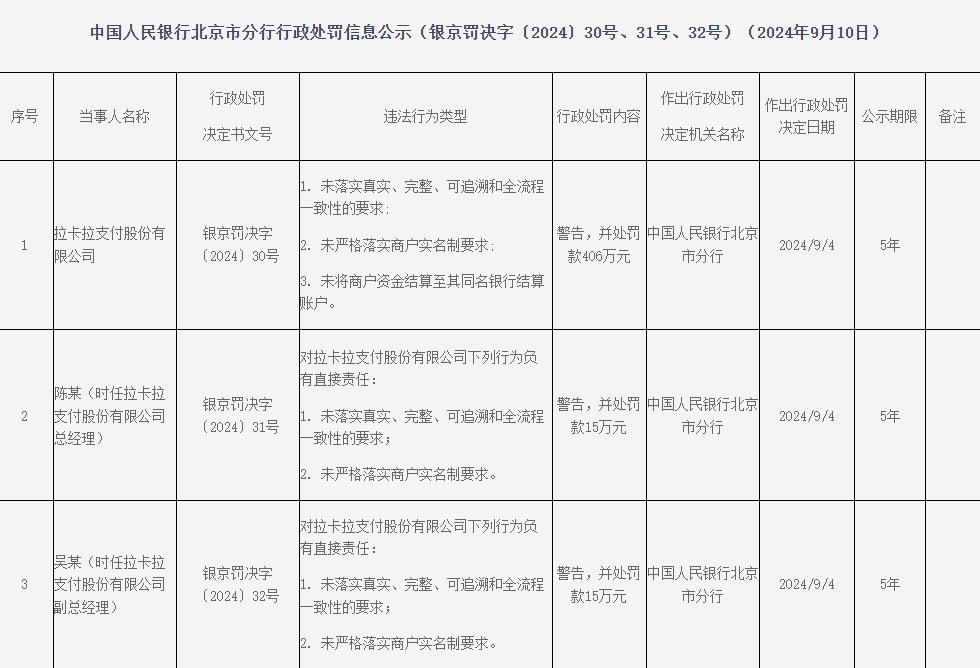 然而,海外扩张野心背后拉卡拉的支付业务合规问题却不容忽视。据不完全统计,该公司2024年共收到7张罚单,累计罚没金额超850万元,其中9月的一张罚单金额高达406万元,直指其存在未严格落实商户实名制要求等问题。