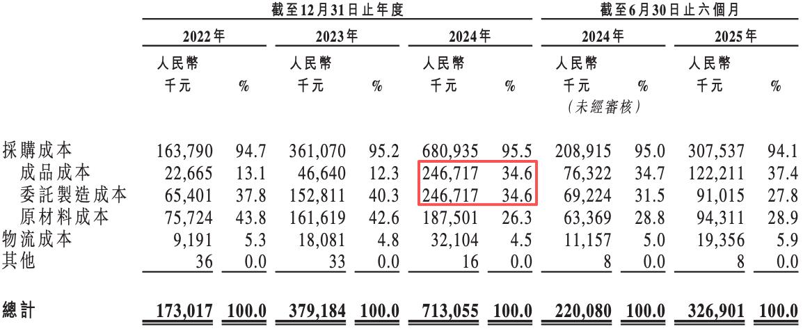 尽管2024年的营收突破16亿元,2025年上半年的收入亦约为8亿元。但不可否认的是,伯希和并未设立自有工厂,所有对外销售的产品均来自外包加工。伯希和在招股书中称,质量控制团队定期进行工厂审核,以评估其是否符合标准、评估其生产能力。