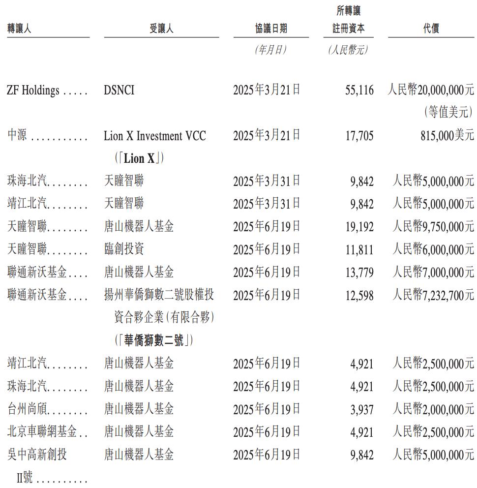 在此期间,亦有多名股东转让所持天瞳威视的股权。以2025年为例,ZF Holdings于2025年3月向DSNCI转让股份股权,代价为人民币2000万元;中源向Lion X转让股份,代价为8.15万美元;珠海北汽、靖江北汽分别向天瞳智联转让股份,均为500万元。