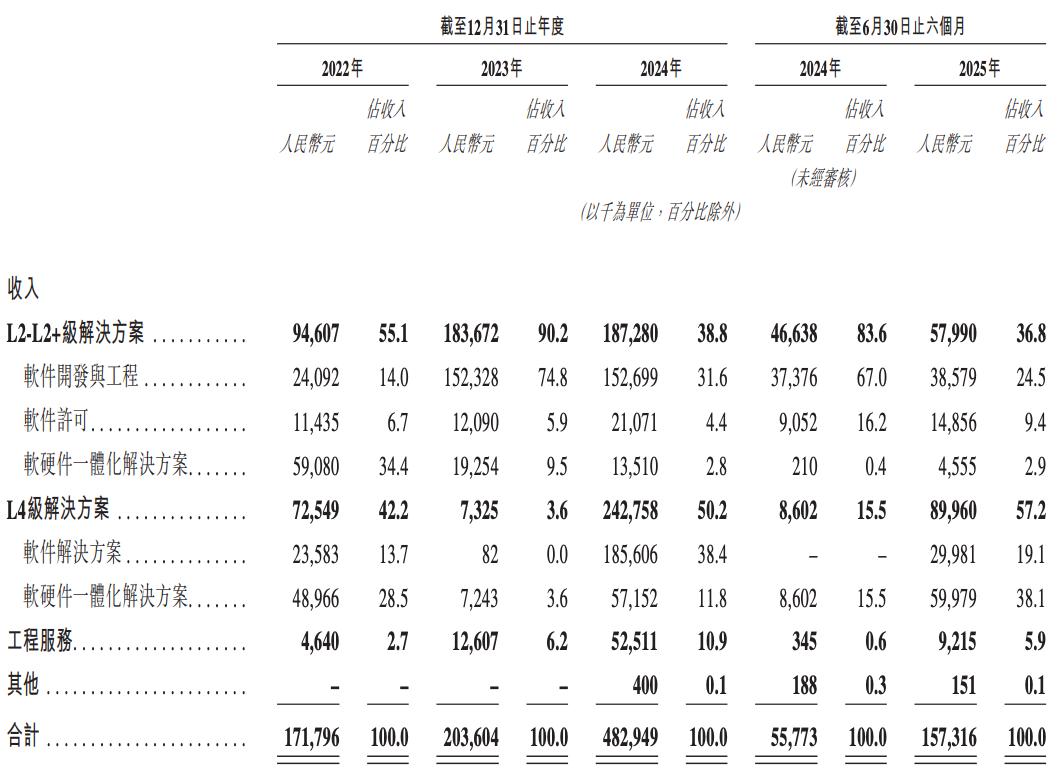 由于L4项目数量及范围大幅增加,天瞳威视2024年的L4级解决方案收入跃升至2.43亿元,占总收入的比例约为50.2%,超过L2-L2+级解决方案板块(占比38.8%),成为该公司的第一大收入来源,并在2025年上半年得以维持。