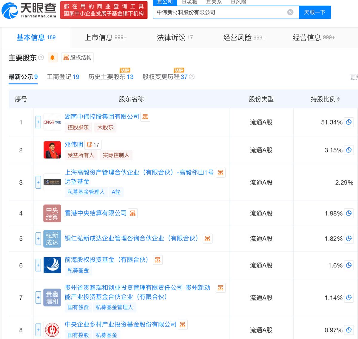 天眼查App信息显示,中伟新材成立于2014年9月,前称为贵州中伟正源新材料有限公司,位于贵州省铜仁市。目前,该公司的注册资本约为9.38亿元,法定代表人为邓伟明,主要股东包括中伟集团、邓伟明等。