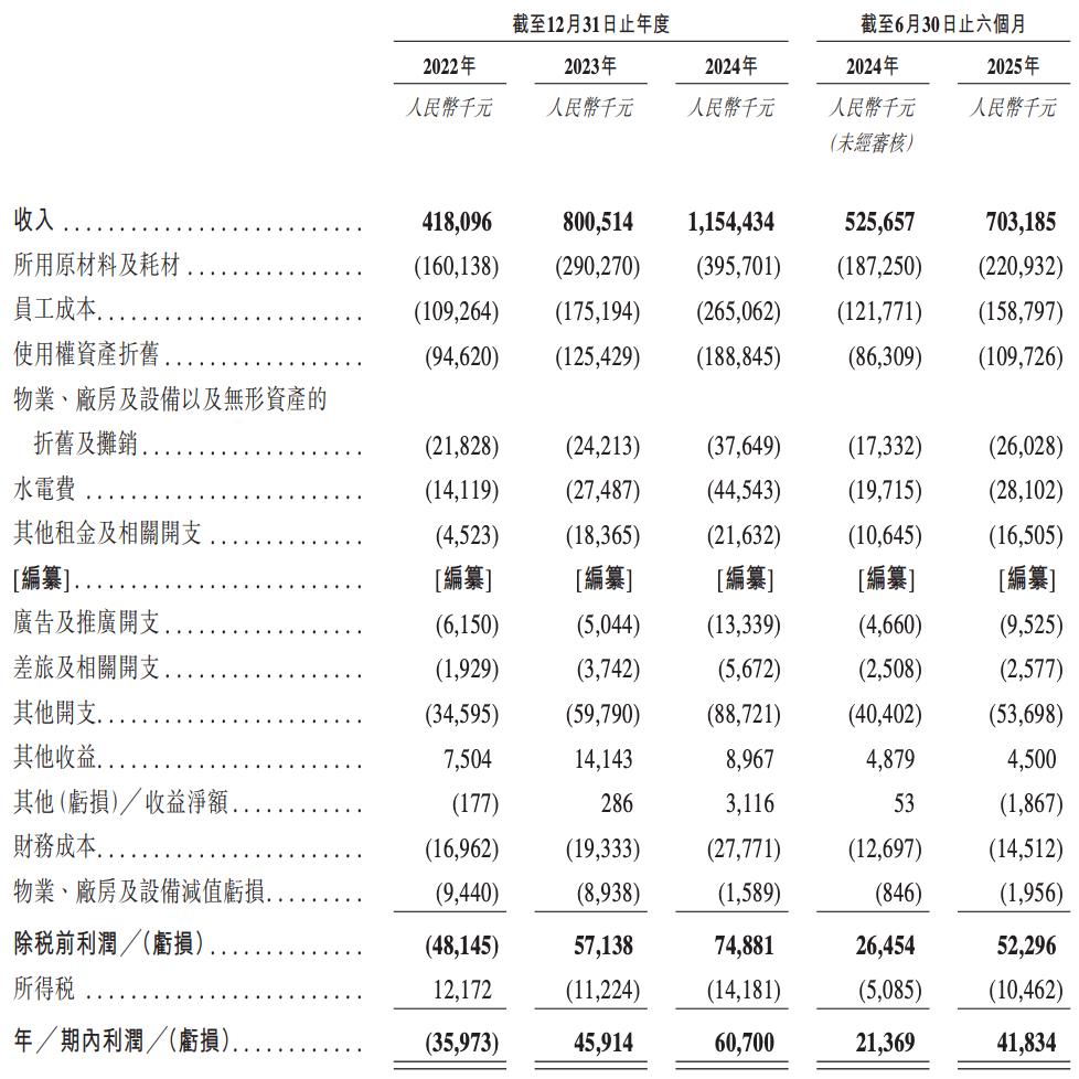 业绩方面,2022年、2023年和2024年度,遇见小面的营收分别约为4.18亿元、8.01亿元和11.54亿元,净利润分别为-3597.3万元、4591.4万元和6070.0万元,经调整净利润分别约为-3497.0万元、4697.8万元和6388.8万元。
