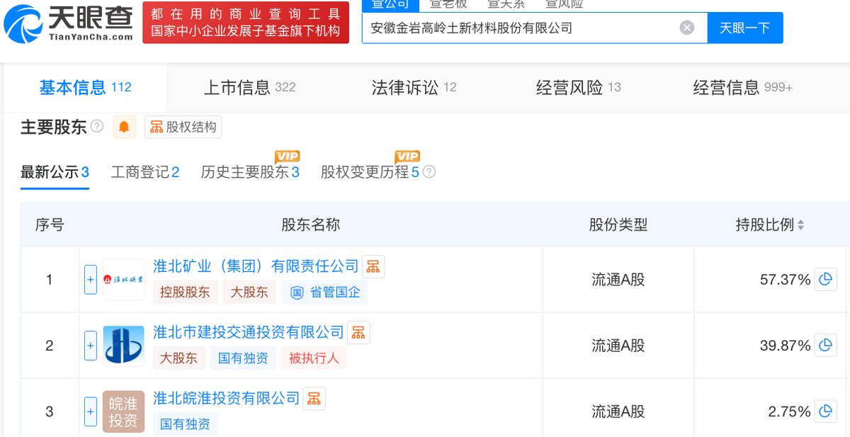 天眼查App信息显示,金岩高新成立于2012年10月,前称为安徽金岩高岭土科技有限公司。目前,该公司的注册资本为7289.4316万元,法定代表人为张矿,主要股东包括淮北矿业集团、淮北建投等。