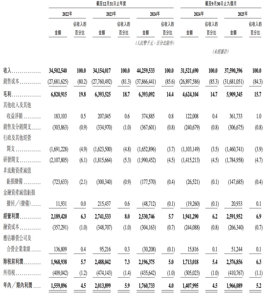 业绩方面,2022年、2023年、2024年度和2025年前9个月,领益智造的营收分别约为人民币345.03亿元、341.54亿元、442.60亿元和375.90亿元,净利润分别约为15.60亿元、20.14亿元、17.61亿元和19.66亿元。