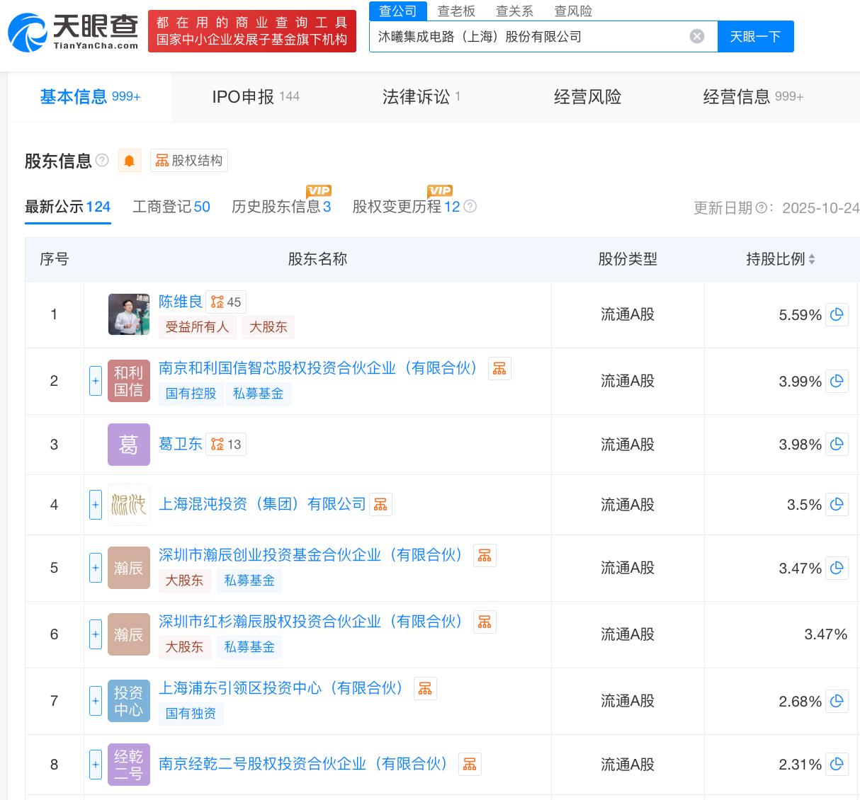 天眼查App信息显示,沐曦股份成立于2020年9月,于2025年1月改制为股份有限公司。目前,该公司的注册资本为3.6亿元,法定代表人为陈维良,主要股东包括上海骄迈、陈维良等。
