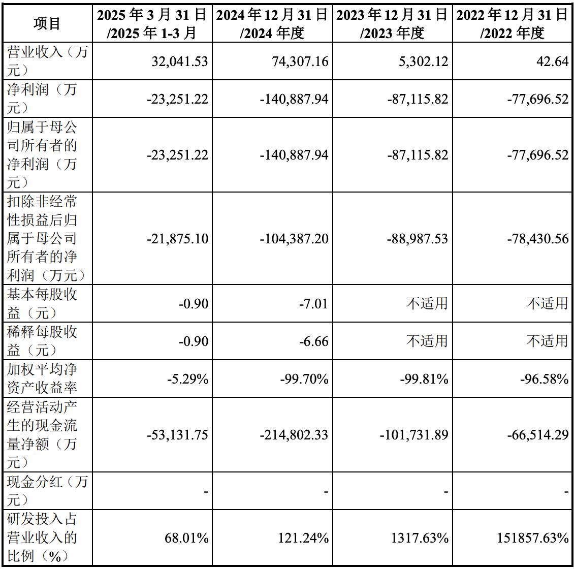 2022年、2023年和2024年度以及2025年第一季度,沐曦股份的营收分别约为42.64万元、5302.12万元、7.43亿元和3.20亿元,净亏损分别约7.77亿元、8.71亿元、14.09亿元和-2.33亿元,扣非后净利润分别约-7.84亿元、-8.90亿元、-10.44亿元和-2.19亿元。