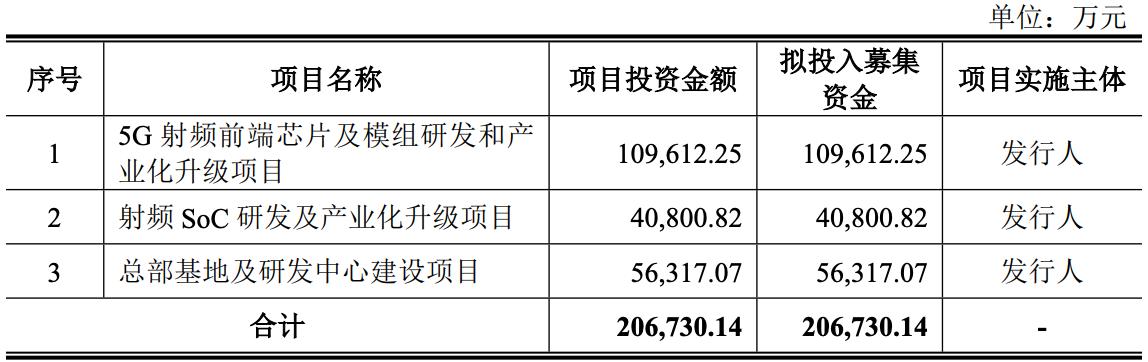 本次报考上市,昂瑞微计划募资20.67亿元。其中,10.96亿元将用于5G射频前端芯片及模组研发和产业化升级项目,4.08亿元用于射频SoC研发及产业化升级项目,另外5.63亿元用于总部基地及研发中心建设项目。