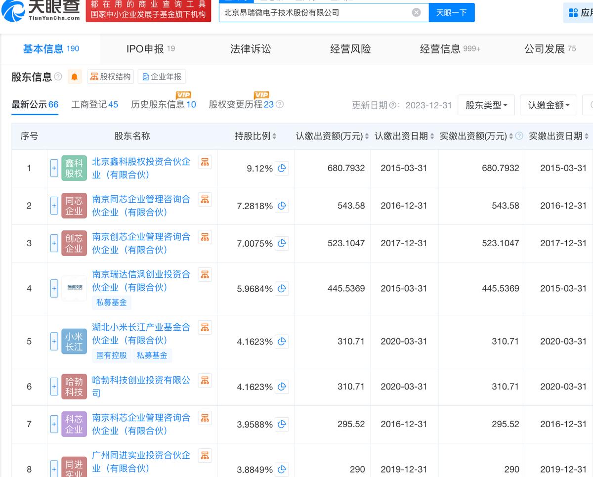 天眼查App信息显示,昂瑞微成立于2012年7月,前身为北京中科汉天下电子技术有限公司(即“北京汉天下”)。目前,该公司的注册资本为7464.8766万元,法定代表人为钱永学,主要股东包括北京鑫科股权投资合伙企业(有限合伙)(下称“北京鑫科”)等。
