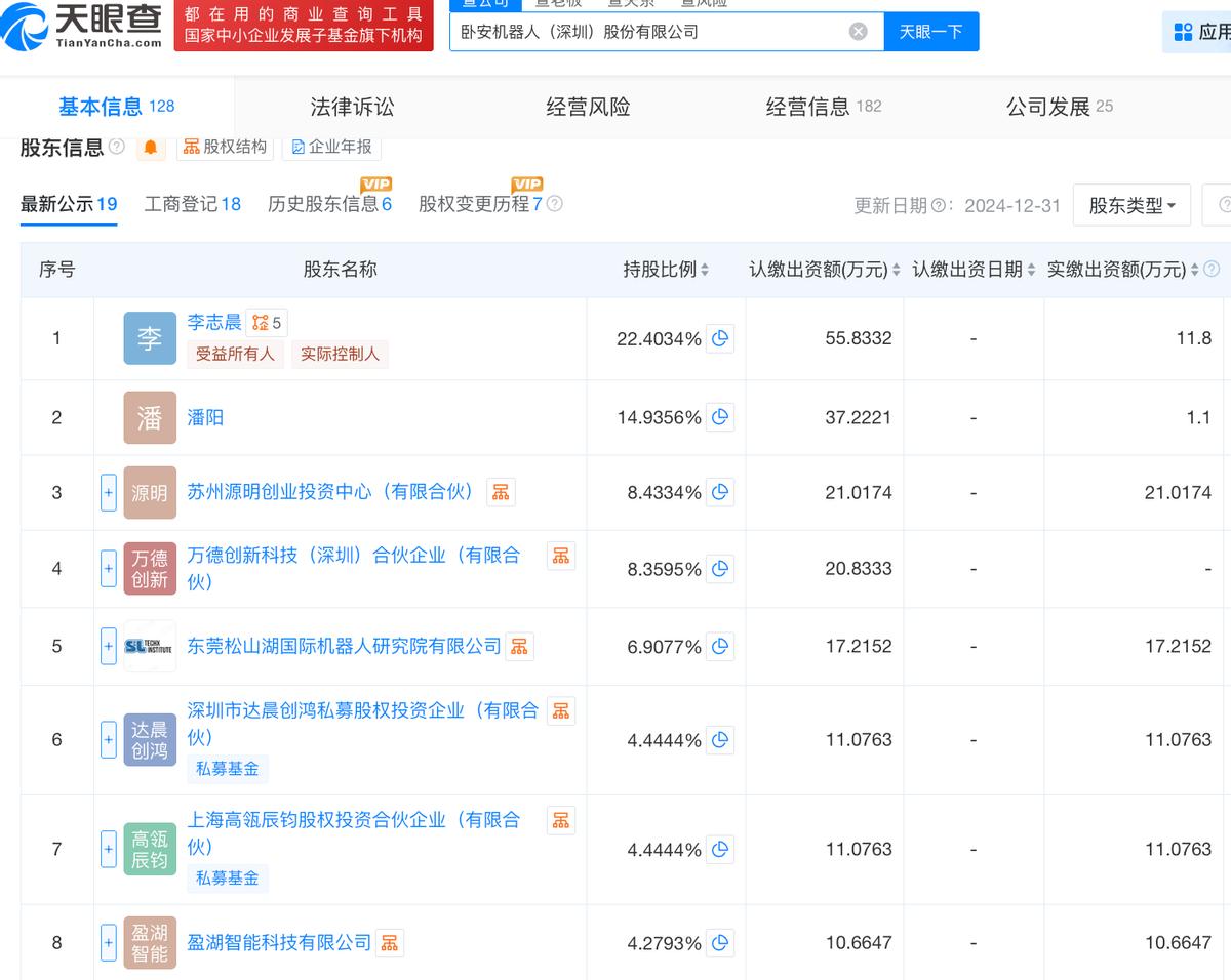 天眼查App信息显示,卧安机器人成立于2018年10月,前身为卧安科技(东莞)有限公司,位于广东省东莞市,于2021年7月迁移至深圳市宝安区。目前,该公司的注册资本为2000万元,法定代表人为李志晨,主要股东包括李志晨、潘阳等。