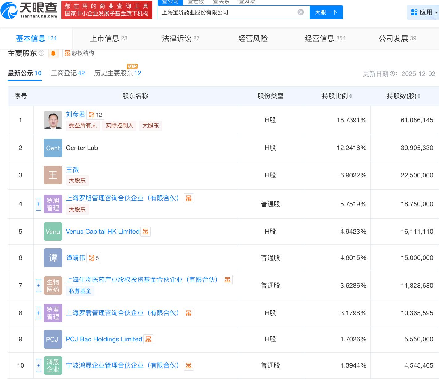天眼查App信息显示,宝济药业成立于2019年12月,位于上海市宝山区。目前,该公司的注册资本为5761.3953万元,法定代表人为刘彦君,主要股东包括刘彦君、王征、Center Lab等。