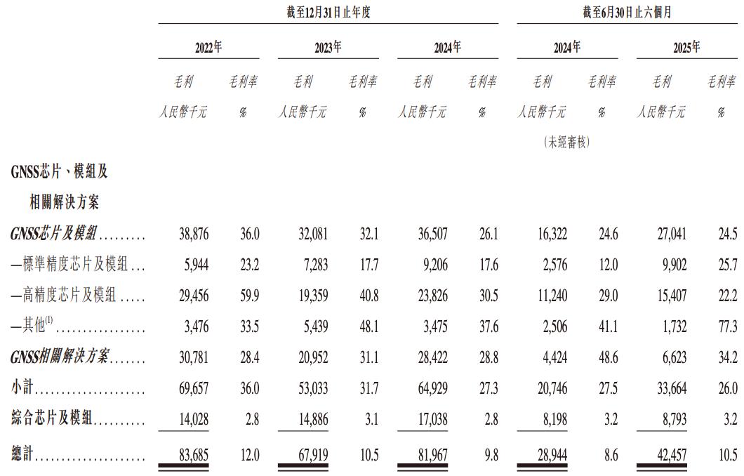 就GNSS芯片、模块及相关解决方案而言,毛利率持续下降。其中,2022年、2023年、2024年度和2025年上半年的毛利率分别为36.0%、31.7%、27.3%和26.0%。从2022年,到2025年上半年已经减少10个百分点。