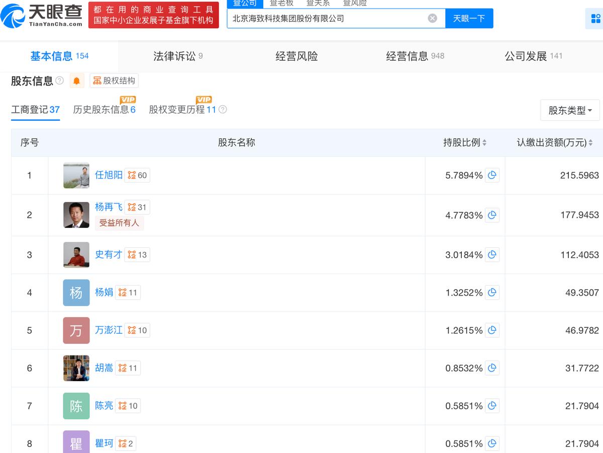 天眼查App信息显示,海致科技成立于2013年8月,前身为北京海智网聚信息技术有限公司。目前,该公司的注册资本约人民币3441.8832万元,法定代表人为杨再飞,主要股东包括任旭阳、杨再飞等。