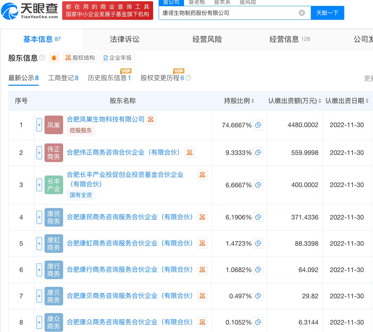 天眼查App信息显示,康诺生物成立于2017年8月,前身为合肥康诺药物开发有限公司。目前,该公司的注册资本为6000万元,法定代表人为王伟,主要股东包括合肥凤巢生物科技有限公司(下称“合肥凤巢”)等。
