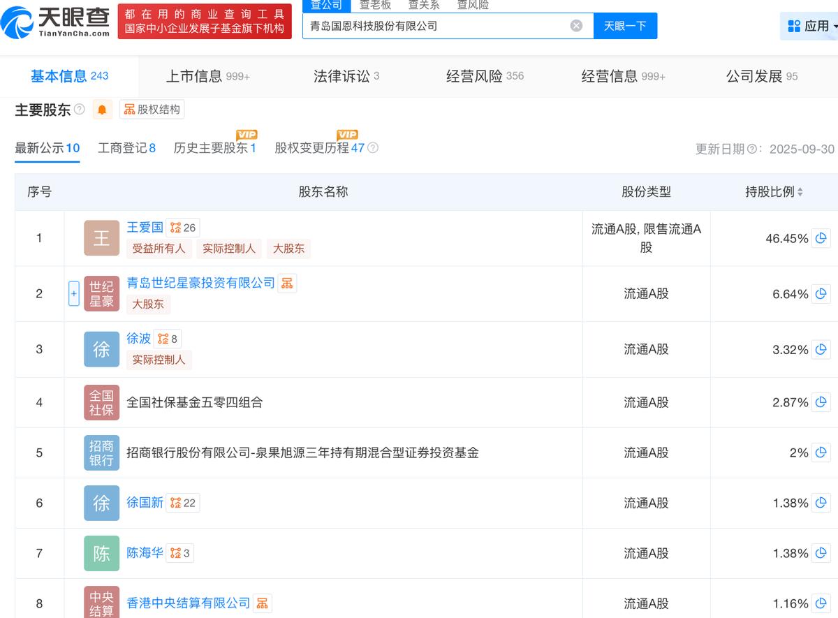天眼查App信息显示,国恩科技成立于2000年12月,位于青岛市城阳区。目前,该公司的注册资本约为2.7亿元,法定代表人为王爱国,主要股东包括王爱国、青岛世纪星豪投资有限公司等。