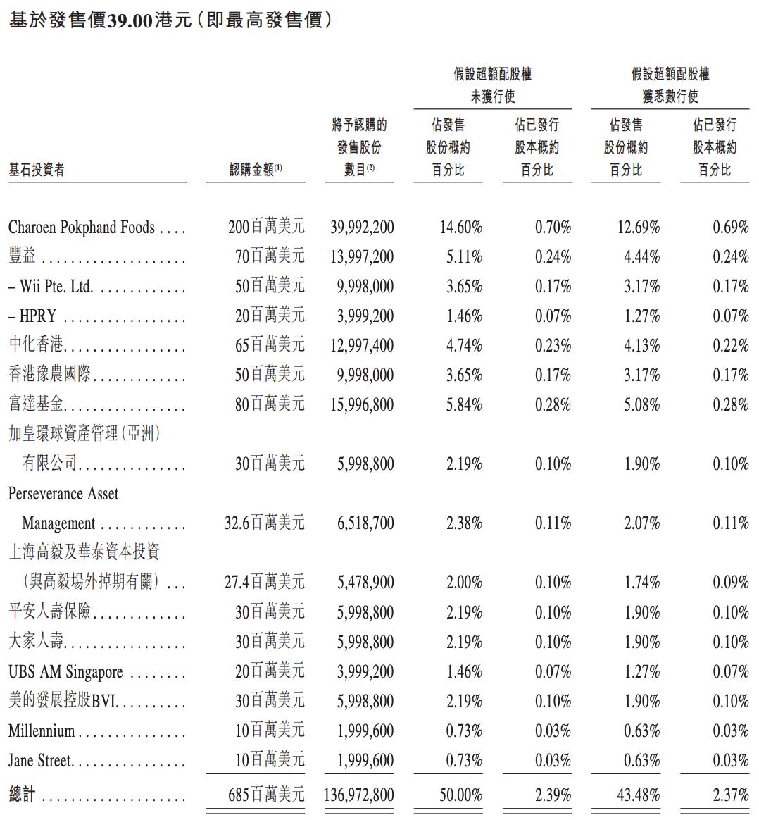 此次上市,牧原股份引入了14名基石投资者,合共认购该公司6.85亿美元(约合53.42亿港元)的股份。其中,基石投资者包括Charoen Pokphand Foods、丰益、中化香港、香港豫农国际、富达基金、平安人寿保险、大家人寿、UBS AM Singapore等。