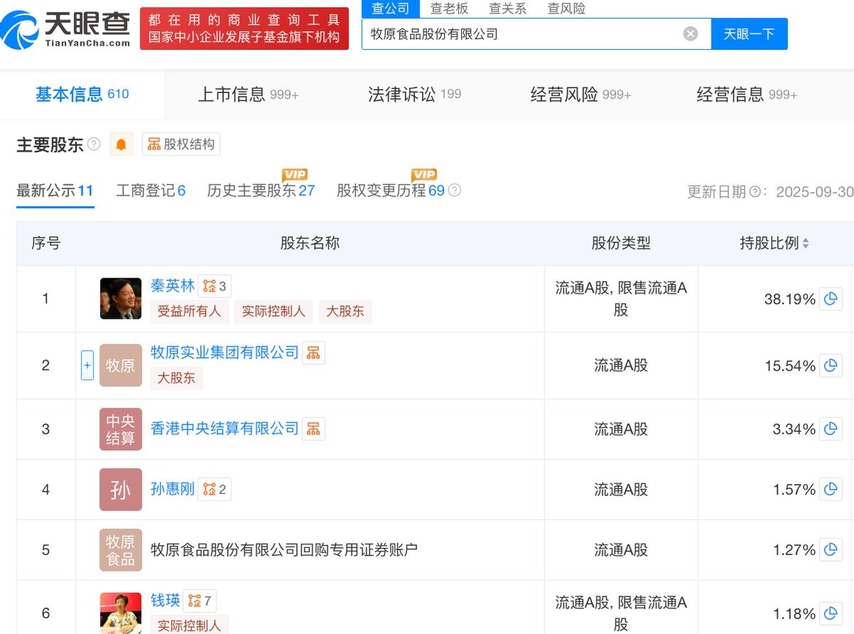天眼查App信息显示,牧原股份成立于2000年7月,位于河南省南阳市。目前,该公司的注册资本约为54.6亿元,法定代表人为曹治年,主要股东包括秦英林、牧原实业等。