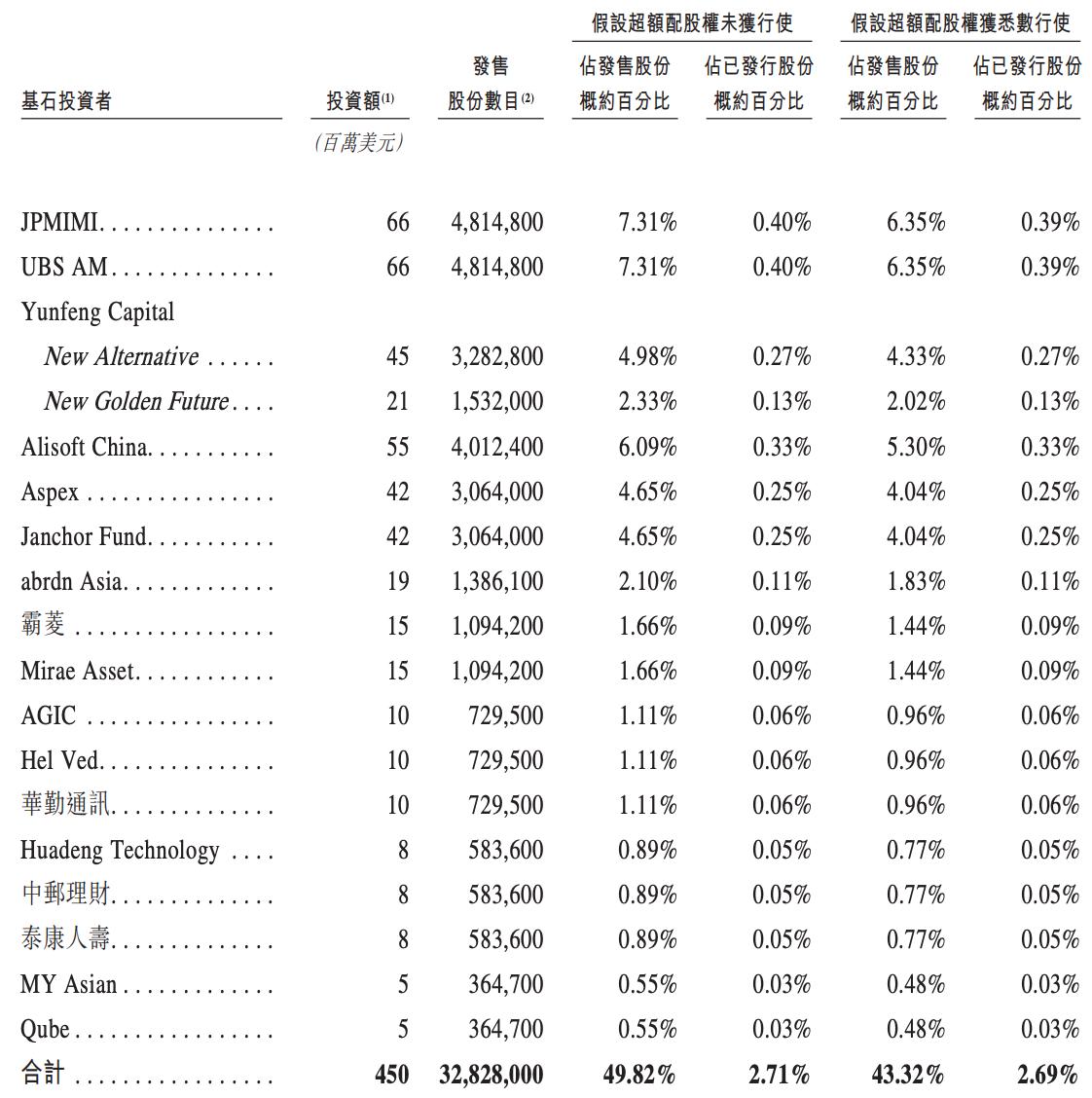 据贝多商业&贝多财经了解,澜起科技引入17名基石投资者,合共认购该公司约4.50亿美元(35.09亿港元)的发售股份。其中,基石投资者包括JPMIMI、UBS、Yunfeng Capital、Alisoft China、霸菱、中邮理财、泰康人寿等。