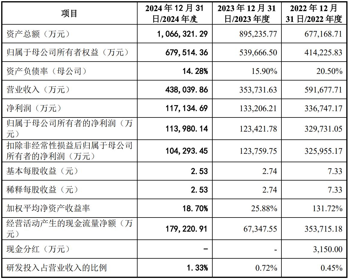 不仅如此,九岭锂业的净利润规模也有所波动。2022年、2023年和2024年,该公司的净利润分别约为33.67亿元、13.32亿元和11.71亿元,扣非后净利润分别约为32.60亿元、12.38亿元和10.43亿元。