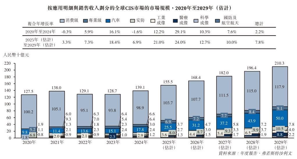那么,长光辰芯所处的赛道究竟有多大?根据弗若斯特沙利文报告,2020年至2024年全球CIS收入由1275亿元增至1391亿元,复合年增长率约2.2%。其中,工业成像、科学成像CIS市场2024年的收入分别占全球CIS市场的2.1%和0.8%。