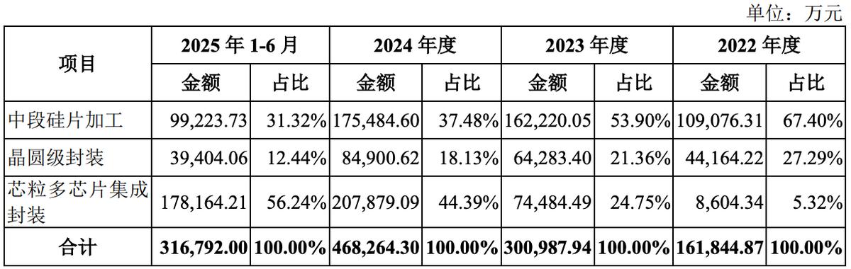 按项目来看,盛合晶微的业务结构有所变阵。2022年、2023年,该公司的主要收入来自中段硅片加工,占比分别为67.40%、53.90%,而2024年则减少至37.48%,2025年上半年进一步降至21.32%。