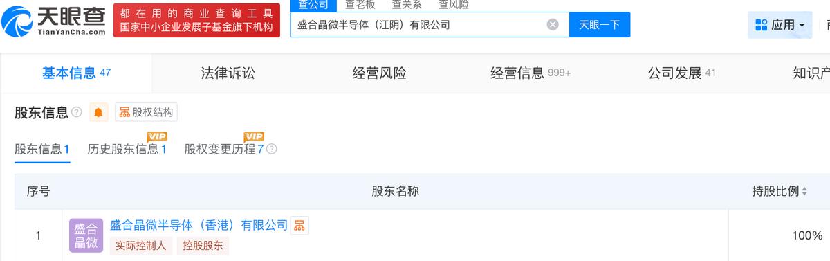 天眼查App信息显示,盛合晶微指的是盛合晶微半导体(江阴)有限公司,成立于2014年11月。目前,该公司的注册资本为15.4亿美元,法定代表人为崔东,由盛合晶微半导体(香港)有限公司全资控制。