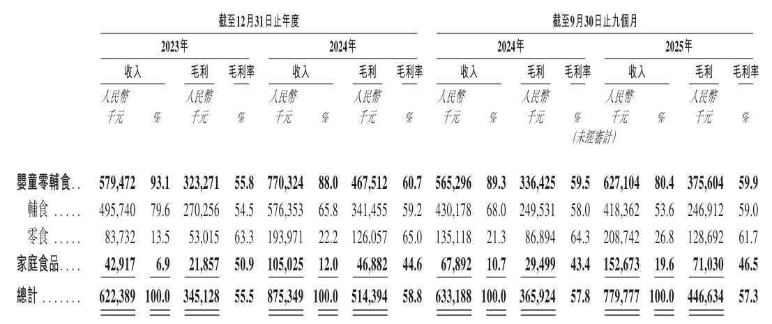 但需注意的是,尽管爷爷的农场积极拓展品类、试图开辟第二增长曲线,婴童零辅食依然是其绝对主力,各期收入占比稳定在八成以上;家庭食品板块的收入占比虽在2025年前三季度提升至19.6%,但对整体收入的贡献仍然有限。