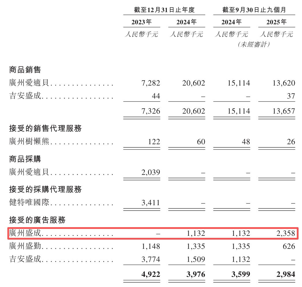 另据招股书披露,爷爷的农场与综合母婴互联网平台“妈妈网”的运营方广州盛成之间,存在电商平台服务、广告服务及KOL推广服务往来,二者2024年、2025年前三季度交易产生的广告服务费分别为113.2万元和235.8万元。