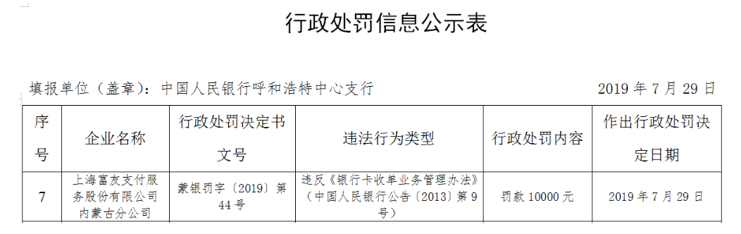 2019年4月,富友支付因违反支付业务规定被央行上海分行处以罚款6万元;同年8月,因违反《银行卡收单业务管理办法》,富友支付被央行呼和浩特中心支行处以罚款1万元。