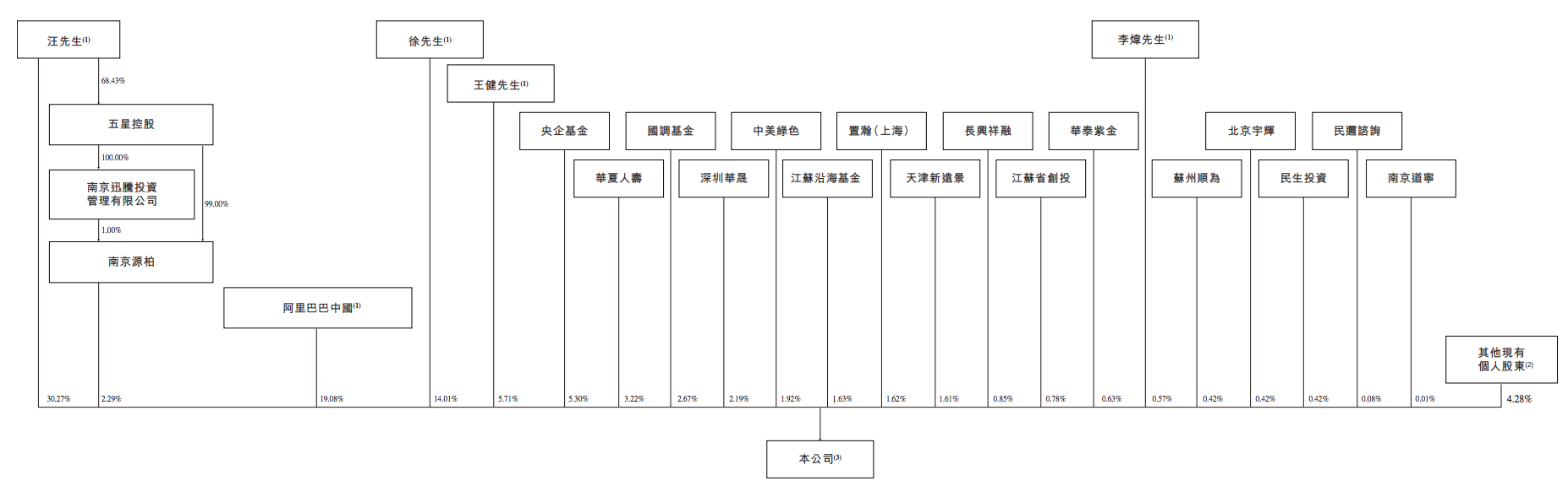 机构方面,阿里巴巴中国为第一大外部股东,持股比例为19.08%;央企基金持股5.30%,华夏人寿持股3.22%,国调基金持股2.67%,华兴资本持股2.19%,中美绿色持股1.92%,江苏沿海基金持股1.63%,其余股东还包括顺为资本等。