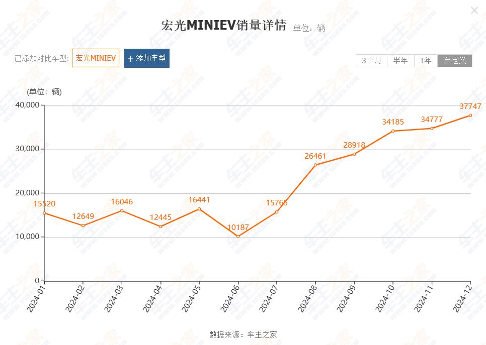 其中,曾经的“国民神车”五菱宏光MINI EV销售降幅尤为显著。根据“车主之家”数据,该款车型2024年的单月平均销量约为2.1万辆,即便是在最畅销的12月,其销量也未超过4万辆,与2022年12月的7.3万辆相距甚远。