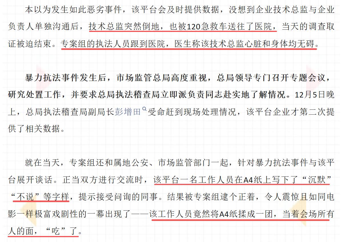 执法人员补充称,本以为发生上述事件后,该平台会配合提供数据,不料企业技术总监与负责人单独沟通后竟突然倒地,也被120急救送医,当天的取证被迫中止。专案组执法人员赶赴医院,却被医生告知其心脏、身体均无异常。