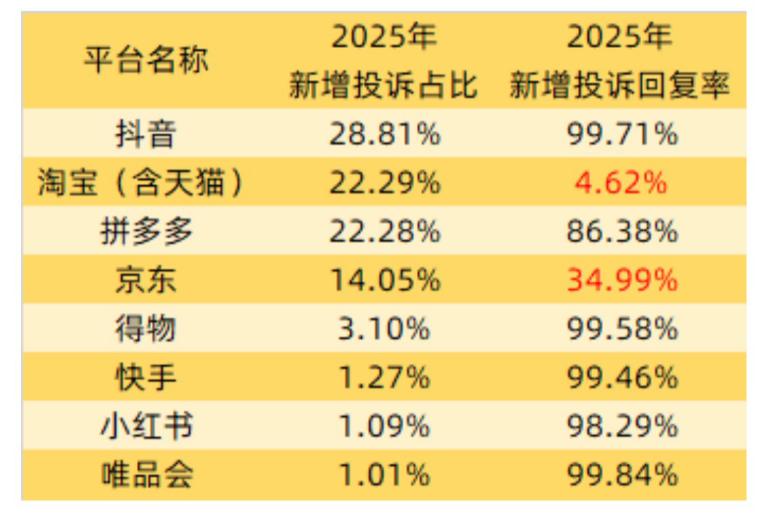 黑猫投诉发布的《2025年度综合电商领域投诉数据报告》亦显示,拼多多平台2025年新增投诉占比约22.28%,在电商平台中排名第三,且总量呈增长态势;新增投诉回复率86.38%,表现尚可。