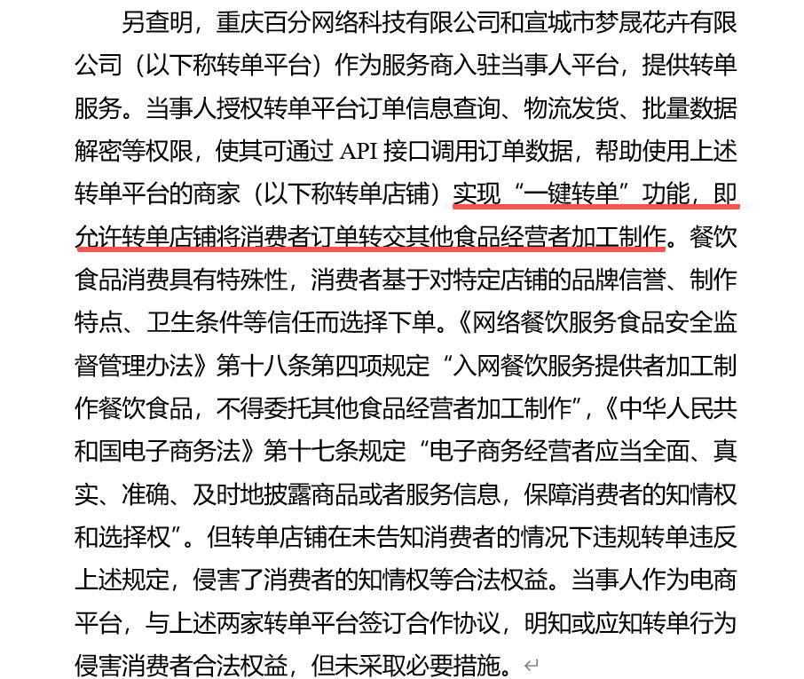 另经查明,拼多多接入了两家第三方服务商,并向后者开放了订单查询、物流发货、批量数据解密等核心权限,使其可通过API接口调用订单数据,为商家提供将消费者订单转发给其他食品经营者进行生产的“一键转单”服务。