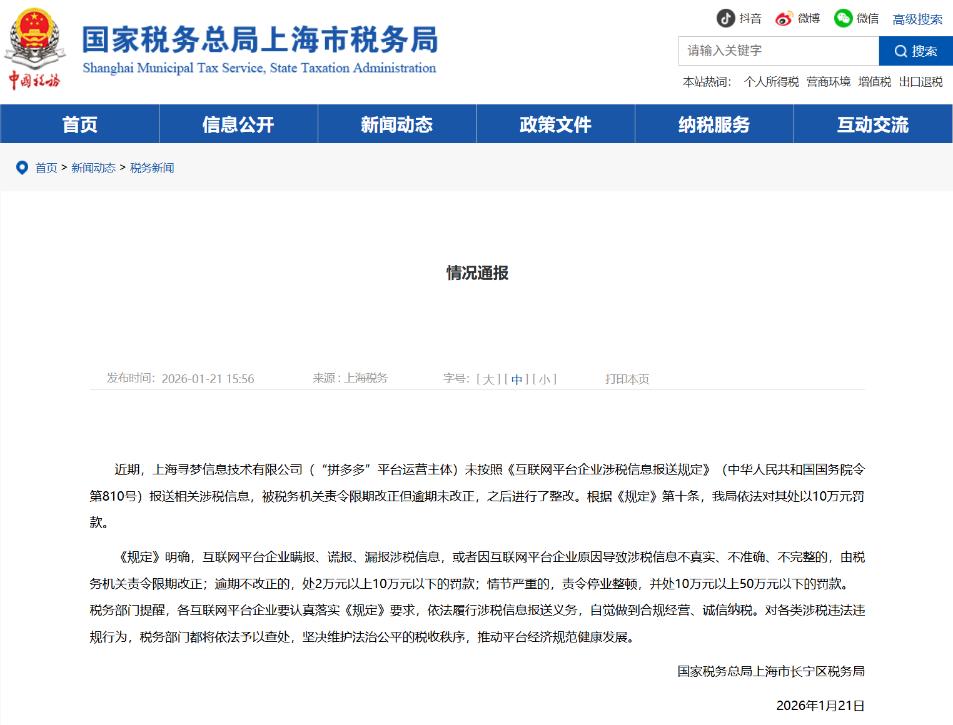 回看拼多多的成长轨迹可知,其合规治理裂痕早已有迹可循。2026年1月,该平台就曾因未按照规定报送第三季度平台内经营者和从业人员涉税信息,被国家税务总局上海市长宁区税务局依法处以10万元罚款。