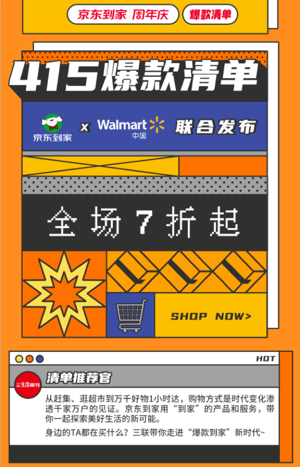 在京东到家4.15周年庆大促期间,京东到家联合沃尔玛筛选全域消费大数据,推出415爆款清单,《三联生活周刊》作为清单推荐官权威推荐,清单甄选出备受消费者喜爱的爆款商品,并同步推出爆款7折起、满99减20神券等多种福利,让消费者“闭眼”买好货。