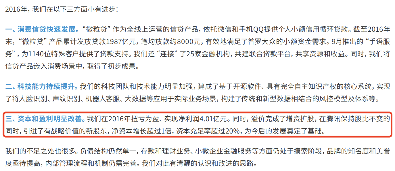 公开信息显示,微众银行曾于2014年开业,是首批试点的5家民营银行之一。2016年,微众银行进行了增资扩股。微众银行在该行2016年年度报告中表示,其“溢价完成了增资扩股,在腾讯保持股比不变的同时,引进了有战略价值的新股东”。