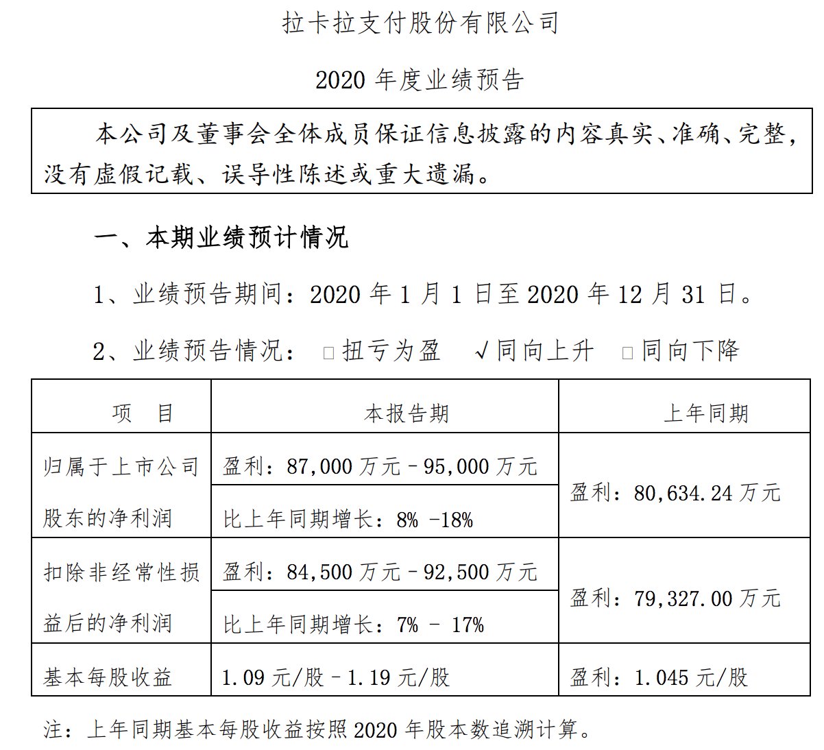1月29日,拉卡拉(SZ: 300773)发布2020年度业绩预告。预告显示,拉卡拉预计2020年实现归母净利润为8.7亿元至9.5亿元,同比增长8%至18%;归母扣非净利润为8.45亿元至9.25亿元,同比增长7%~17%。