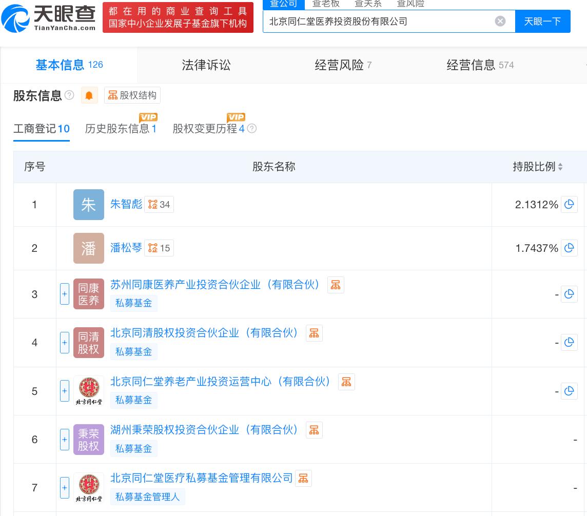 天眼查App信息显示,同仁堂医养成立于2015年3月,前身为北京同仁堂投资发展有限责任公司。目前,该公司的注册资本约为3.57亿元,法定代表人为饶祖海,主要股东包括同仁堂等。