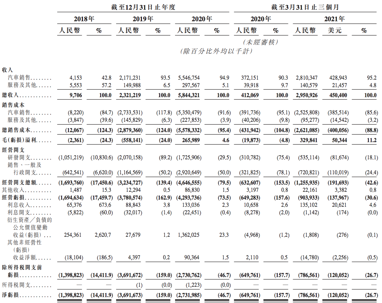 不过,小鹏汽车并未实现盈利。2018年、2019年与2020年,小鹏汽车的净亏损分别为13.99亿元、36.92亿元、27.32亿元。2021年第一季度,小鹏汽车净亏损7.87亿元,而2020年同期净亏损6.50亿元。