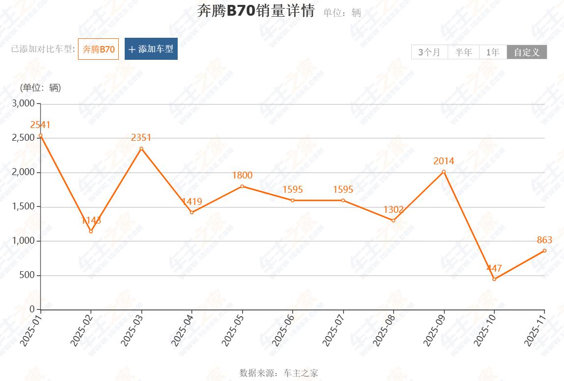 只不过,受到近年来新能源汽车全面崛起的冲击,一汽奔腾B702024年的累计销量已降至39277辆;2025年11月奔腾B70的单月销量仅863辆,前11月累计销量约1.7万辆,昔日的“当家花旦”正逐步丧失市场优势。