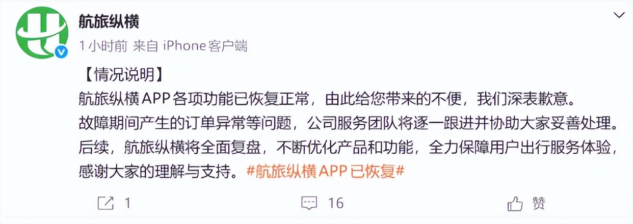 故障发生后,航旅纵横于当日下午15:06发布情况说明,承认部分功能异常,建议旅客暂时通过航空公司、机场柜台等渠道查询行程,并称“技术团队正在全力抢修”。